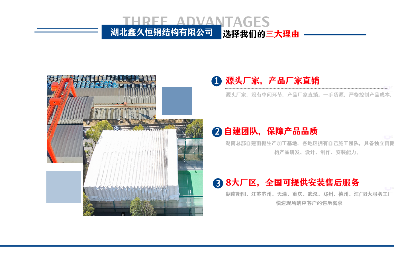 湖北鑫久恒鋼結(jié)構(gòu)有限公司是一家電動(dòng)雨棚、膜結(jié)構(gòu)車(chē)棚研發(fā),生產(chǎn)銷(xiāo)售,施工安裝于一體的專(zhuān)業(yè)鋼結(jié)構(gòu)科技公司,主要產(chǎn)品有伸縮雨棚,電動(dòng)雨棚,膜結(jié)構(gòu)車(chē)棚等?! 『系貐^(qū)職員目前有80多人,占地面積20000平方米,廠房面積15600平方米,配備先進(jìn)的生產(chǎn)流水線,使每件品質(zhì)產(chǎn)品的堅(jiān)實(shí)基礎(chǔ)。 公司在蘇州、天津、重慶、武漢、德州、烏魯木齊、江門(mén)均設(shè)有服務(wù)工廠,總?cè)藛T共300多人,擁有專(zhuān)業(yè)的技術(shù)團(tuán)隊(duì),配備先進(jìn)的設(shè)備和流水線生產(chǎn),產(chǎn)能高,貨源充足,發(fā)貨速度快,服務(wù)區(qū)域廣?! ∫苿?dòng)伸縮棚適用于通道臨時(shí)倉(cāng)儲(chǔ)、戶外運(yùn)動(dòng)遮陽(yáng)、污水池遮蓋、能源交通、熱力化工、礦山、船舶制造及市政建設(shè)、物流、碼頭等領(lǐng)域的構(gòu)件制作加工,成品半成品存放、倉(cāng)庫(kù)、野外儀器設(shè)備操作用房等。尤其是對(duì)工廠發(fā)貨、倉(cāng)儲(chǔ)臨時(shí)遮雨防嗮,梅雨期較長(zhǎng)、建設(shè)周期較短的工程施工等特別適用。還可根據(jù)用戶需求量身定制、適合企業(yè)所需不同款式的產(chǎn)品?! ∥夜緢?jiān)持“誠(chéng)信社會(huì)為本,客戶滿意為榮”的經(jīng)營(yíng)理念,做到質(zhì)量把控,嚴(yán)格管理,精益求精,恪守承諾。使鑫久恒逐步走向成熟,其系統(tǒng)化、專(zhuān)業(yè)化日趨完善。以專(zhuān)業(yè)的技術(shù)、科學(xué)的管理,更高的產(chǎn)品質(zhì)量,優(yōu)良的企業(yè)信譽(yù),真誠(chéng)的客戶服務(wù),靈活多樣的經(jīng)營(yíng)方式和務(wù)實(shí)創(chuàng)新的企業(yè)精神愿與社會(huì)各界攜手合作,為推動(dòng)智能鋼結(jié)構(gòu)建筑事業(yè)的發(fā)展而不斷努力。...